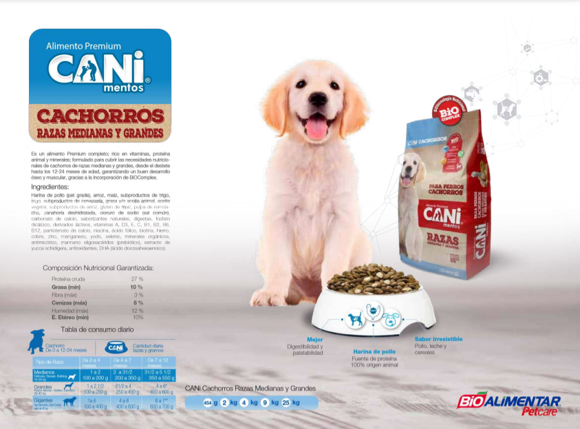 Es un alimento premium completo, rico en vitaminas, proteína animal y mineral; Formulado para cubrir las necesidades nutricionales de cachorros; Garantizando un buen desarrollo óseo y muscular.