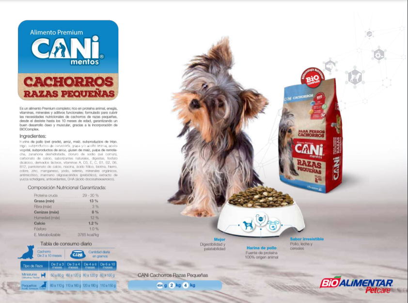 Es un alimento premium completo, rico en proteína animal, energía, vitaminas. Formulado para cubrir las necesidades nutricionales de cachorros de razas pequeñas. Garantizando un buen desarrollo óseo y muscular.